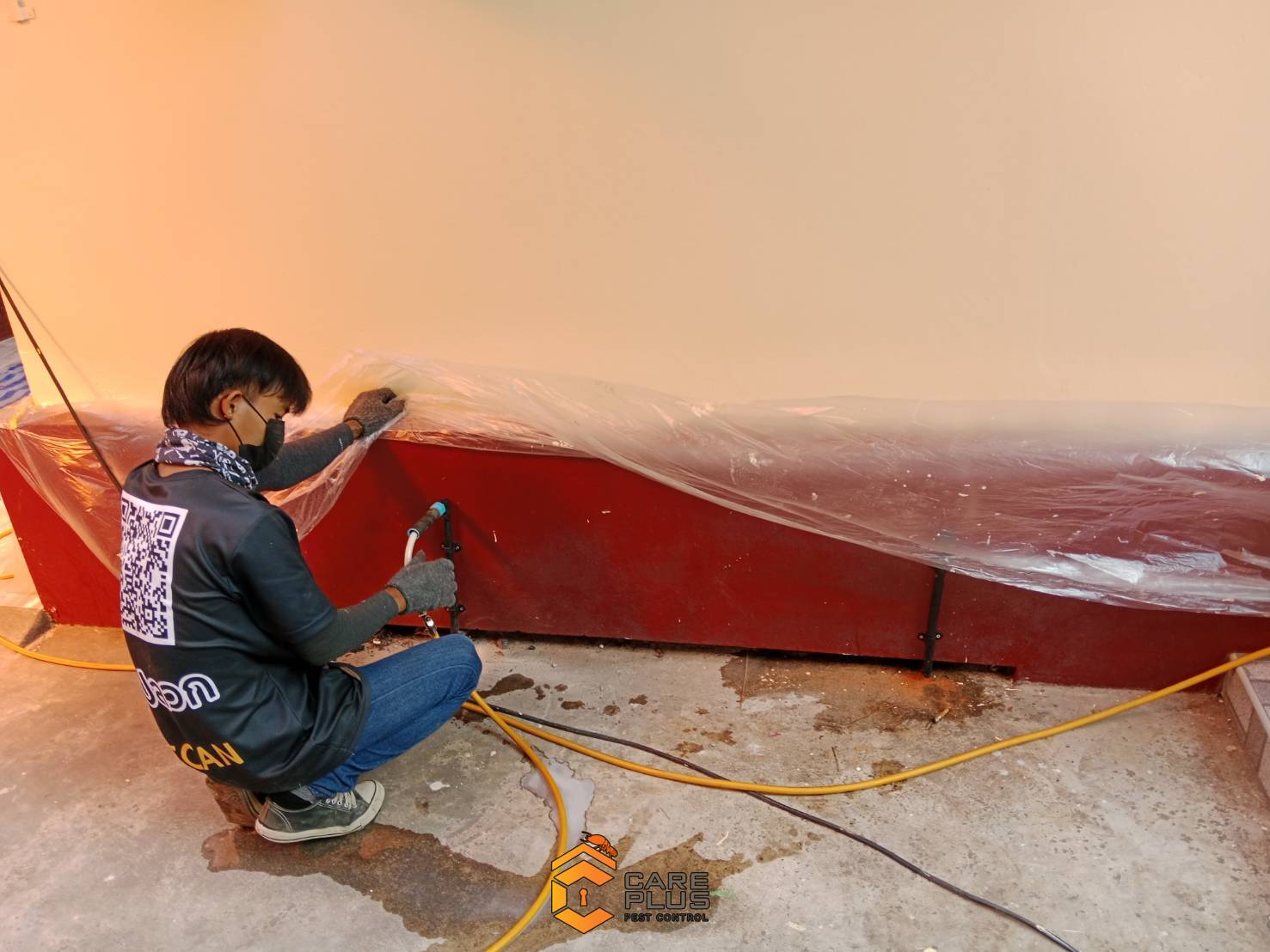 ฉีดพ่นสารเคมีบริเวณ ทางเดินของปลวก ตามขอบวงกบ ขอบบัว เฟอร์นิเจอร์ไม้