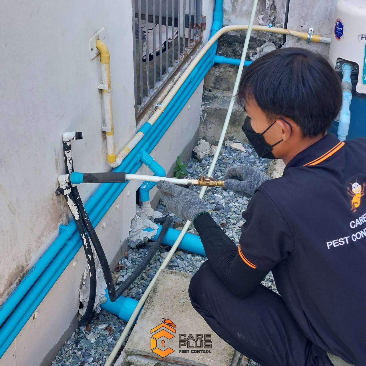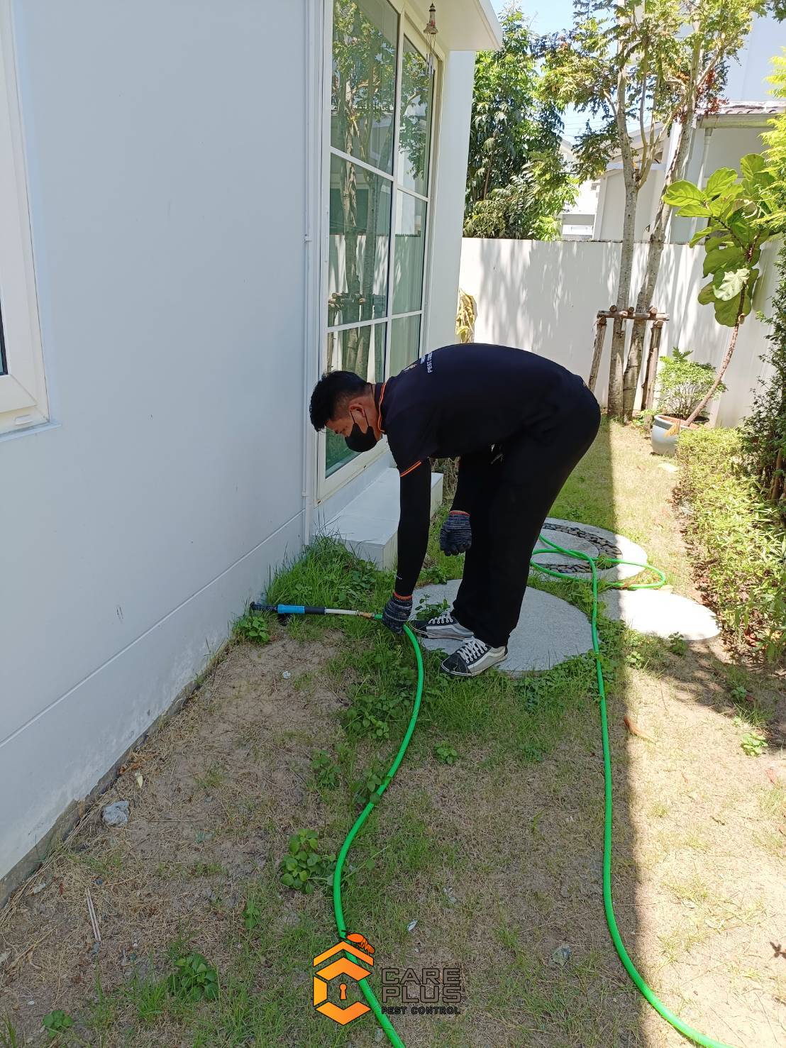 อัดน้ำยาลงดินรอบตัวอาคาร บริเวณพุ่มไม้ และไม้ยืนต้น ไม้ค้ำยัน เพื่อกำจัดปลวกที่อยู่ใต้ดิน